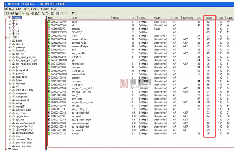 我们通常用RSSI(Received Signal Strength Indication,用户实际接收信号强度)来表示信号强度,RSSI可以通过软件测出来: